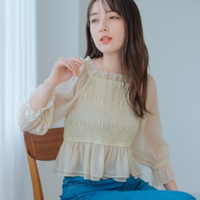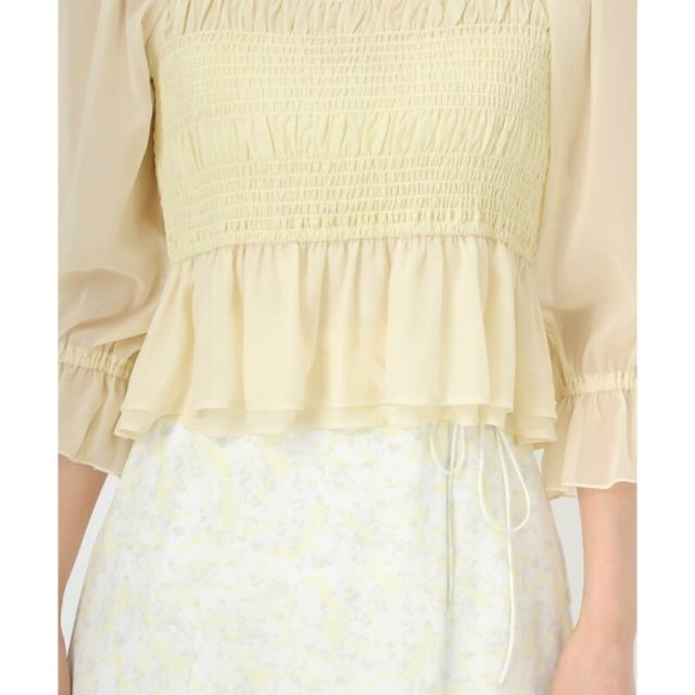 パールのような上品な輝きのシフォンでフェミニンな雰囲気を演出するブラウス。くしゅくしゅとしたシャーリングが豊かな表情をプラス。ふんわりとした裾のフリルやシアースリーブも女性らしさを一層引き立たせてくれます。カジュアルなデニムと合わせても愛らしいコーデに決まるアイテムです。■fabric透け感[有り]裏地[無し]伸縮性[有り]生地の厚さ[薄手]