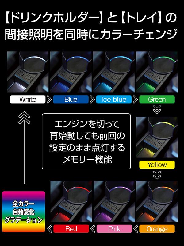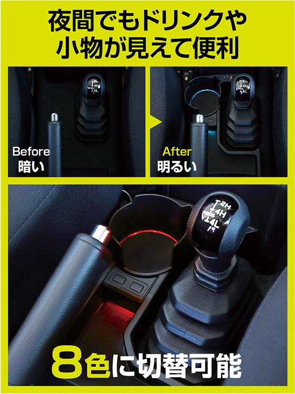★ドリンクホルダーとトレイの内底に間接照明を装備しているので、暗い車内でもドリンクや小物の出し入れに便利です。