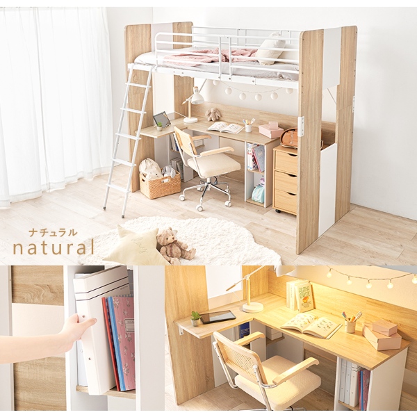 天板が広々使えるL字型のデスクが一体となったロフトベッド。ファイルや教科書の収納もできるサイドシェルフ付き。