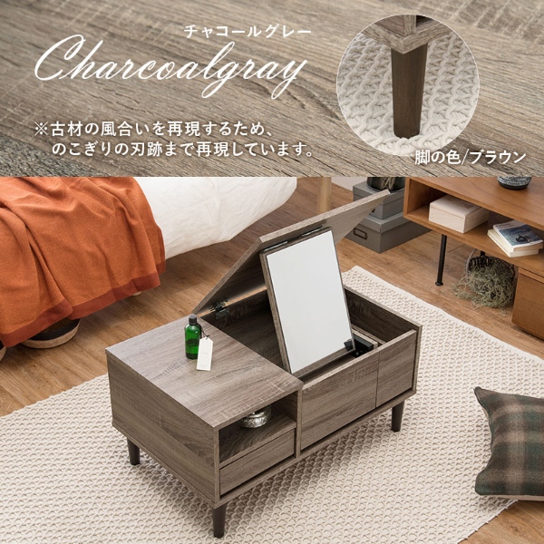 天板を開ければドレッサーとして使えるセンターテーブル。 ■カラー チャコールグレー ■サイズ(約) 幅75×奥行45×高さ38cm ■素材 主材:プリント紙化粧パーティクルボード ■生産地 インドネシア製 ■組立 お客様組立品 ※大人2人以上での組立をおすすめします。ドライバーとハンマーをご用意ください。 ※お客様組立て品につきましては、組み立て後に不良の連絡をされても対応ができません。組み立て前にパーツに不良・傷等がないか、必ずご確認下さいますようよろしくお願い申し上げます。 ※記載は商品仕様の一部です。仕様説明不足等の理由での返品はできません。特に適合等は必ずご確認ください。