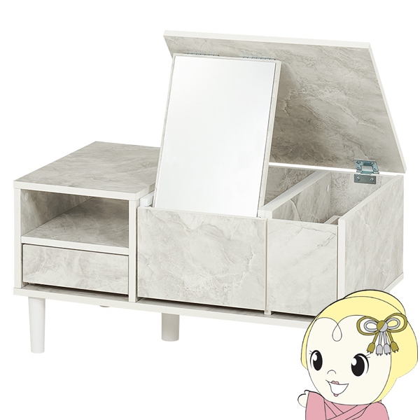 天板を開ければドレッサーとして使えるセンターテーブル。 ■カラー マーブルホワイト ■サイズ(約) 幅75×奥行45×高さ38cm ■素材 主材:プリント紙化粧パーティクルボード ■生産地 インドネシア製 ■組立 お客様組立品 ※大人2人以上での組立をおすすめします。ドライバーとハンマーをご用意ください。 ※お客様組立て品につきましては、組み立て後に不良の連絡をされても対応ができません。組み立て前にパーツに不良・傷等がないか、必ずご確認下さいますようよろしくお願い申し上げます。 ※記載は商品仕様の一部です。仕様説明不足等の理由での返品はできません。特に適合等は必ずご確認ください。