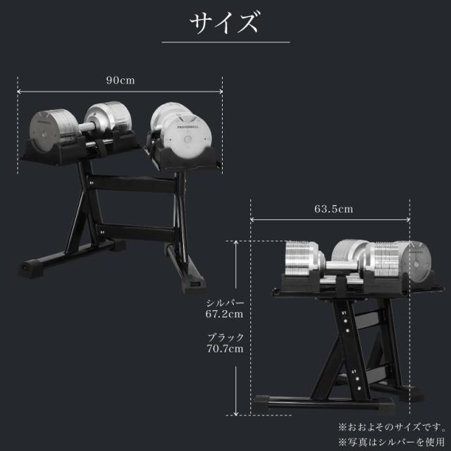 | 本体サイズ | W:90cm × D:63.5cm × H:67.2cm(ダンベル2個 シルバー + スタンドPro) W:90cm × D:63.5cm × H:70.7cm(ダンベル2個 ブラック + スタンドPro) |