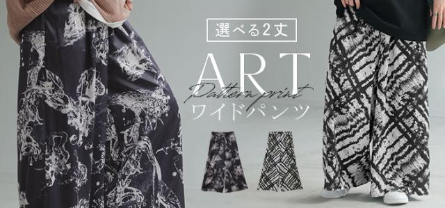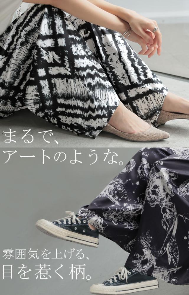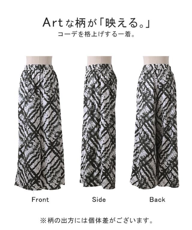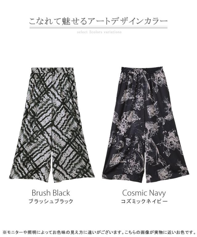 パンツ 柄 ワイドパンツ レディース 総柄 アート ワイド ロング ロングパンツ 体型カバー ボトムス ボトム ストレート ズボン ゆったり ハイウエスト 美脚 ゴム 軽量 薄手 大きいサイズ おしゃれ 幾何学 ペイント 水彩画 ネイビー 黒 春 冬 HUG.U 秋新作