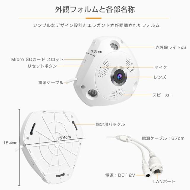 ・魚眼レンズ:360度レンズ搭載で、全方位に渡り部屋の隅々まで無死角に見渡せます。