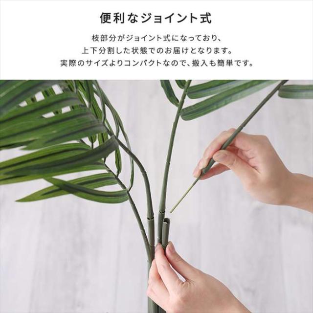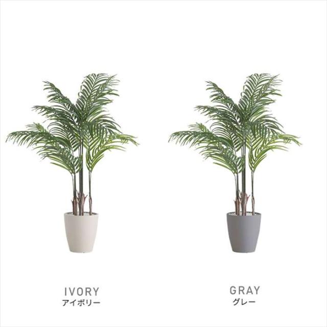お手入れ簡単なアレカヤシのフェイクグリーンSサイズ120cm。カラーは、グレー(4535306247362:SH-06-ARE-S--GY)、アイボリー(4535306247355:SH-06-ARE-S--IV)、です。ジョイント式で上下分割で梱包されているので、実際のサイズより梱包はコンパクトで搬入もしやすくなっています。枝葉はリアルさを追求し高品質なPE素材を使用しています。鉢付なので別で鉢カバーを買う必要もありません。