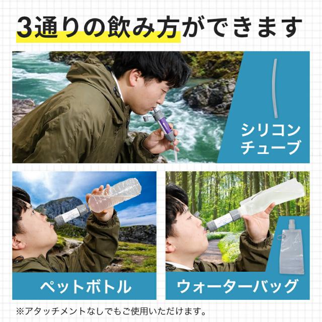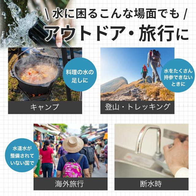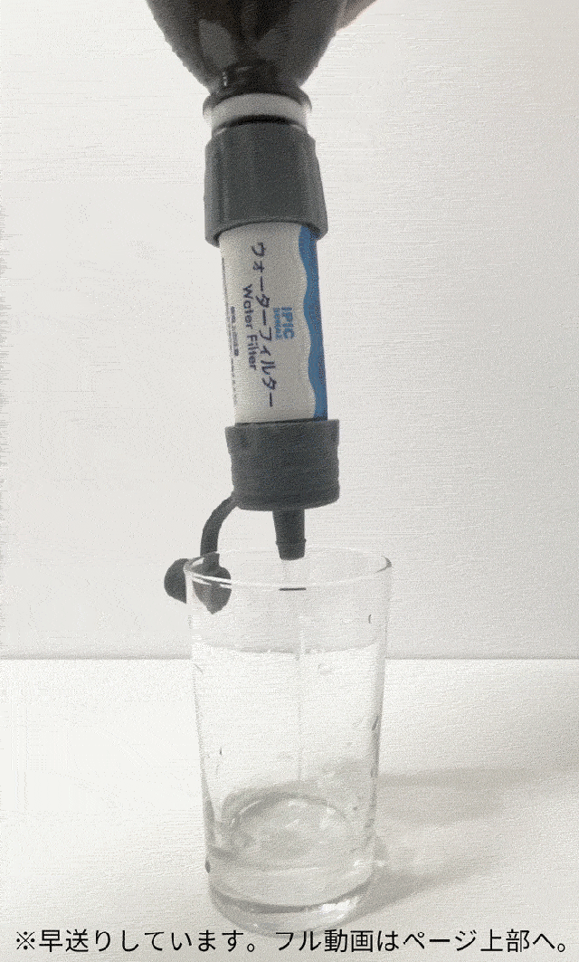●ボトルに水を入れ押し出すと、簡単に使えるアイテム。ウイルス・バクテリアを99%除去することができます。