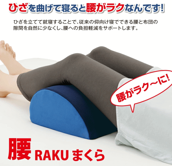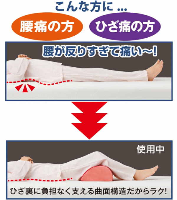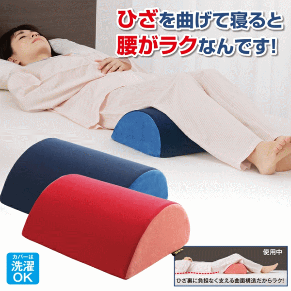 ひざを曲げて寝ると腰がラクなんです!膝を立てて就寝することで従来の仰向け寝でできる腰と布団の隙間を自然に少なくすることができこの隙間を埋めることにより腰への負担軽減をサポート!膝痛の方は膝裏をやさしく支えてあげることでリラックスに!ひざ裏に負担なく支える曲面構造だからラク!肌触りの良いメッシュ素材。リビングなどで背もたれとしてやソファでひざ上のクッションとしても使える!就寝時はもちろんリラックスタイムやお昼寝の休息時に!カバーのみ丸洗い可能。■本体サイズ約縦26×横34×高さ12.5cm■本体重量約270g■材質[カバー]ポリエステル100%[詰め物]繊維:ポリエステル100%、中材:ウレタンフォーム■カラー:レッド、ブルー■生産国:中国製(企画・デザイン:日本)※カバーのみ洗濯可能(洗濯ネット使用)