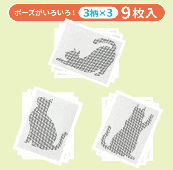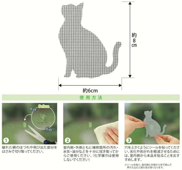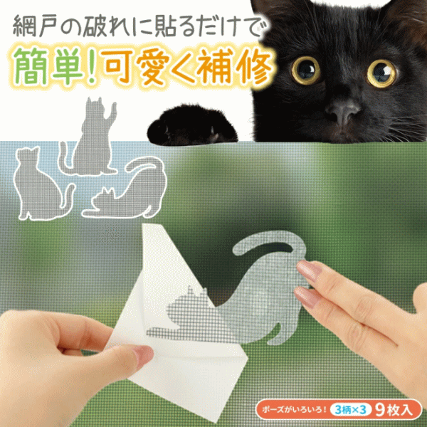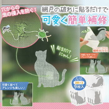 網戸の穴をニャンコがふさいで虫の侵入をストップ!網戸にモノや昆虫などがぶつかってできた穴やキズ、網戸の劣化による破れは見栄えが悪いだけでなく嫌な虫が入ってきます。網戸の穴や破れを貼るだけで簡単に補修ができるニャンコの可愛い補修シール。シールタイプだから切らずに簡単に貼れる。大きな穴でも2〜3枚並べて貼れば補修完了!メッシュ柄の耐久性の高いガラス繊維素材。■本体サイズ[1枚辺り]約縦8×横6cm■本体重量[1枚辺り]約1g■材質:ガラス繊維 、アクリル系粘着剤■色柄:ネコ3柄×3■生産国:中国製(企画デザイン:日本)※本品には通気性はありません。【ネコポスでのお届けとなります】送料無料ですが代引き発送はできません。発送後一部地域を除き2〜3日で投函となります。ネコポスには配達保証がありません。宅配便での発送をご希望の場合は店舗指定の送料770円が別途掛かります。ご注文数によっては宅配便で発送させて頂く場合があります。その際はご注文時にご入力お願い致します。他商品との同梱及び代引き発送、配達日時指定はできません。