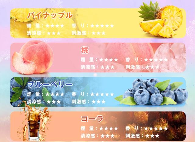 ・リキッド成分:グリセリン、プロピレングリコール、植物性香料、ニコチン・タール0
