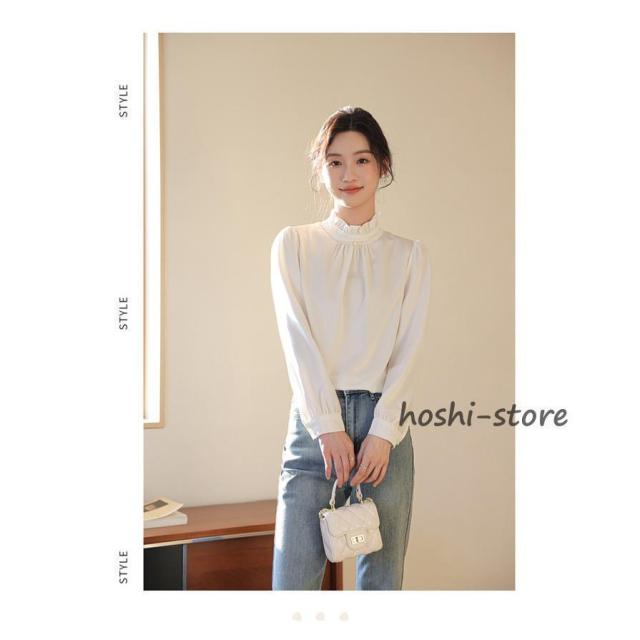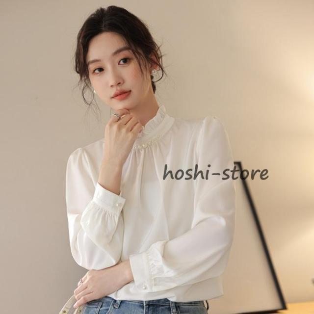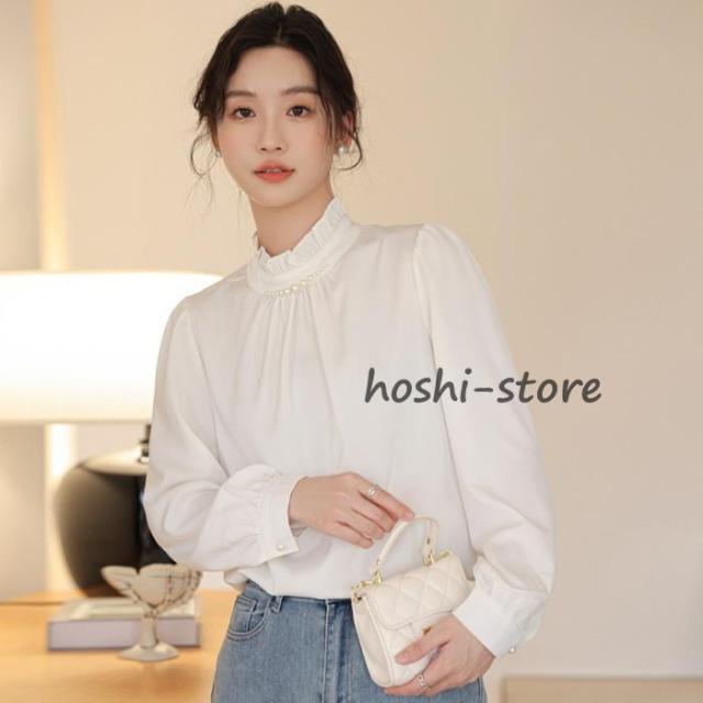 パール付き ブラウス レディース パール フォーマル トップス シャツ ハイネック 長袖 ギャザー ハイネックブラウス