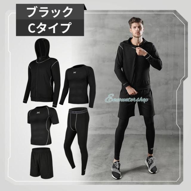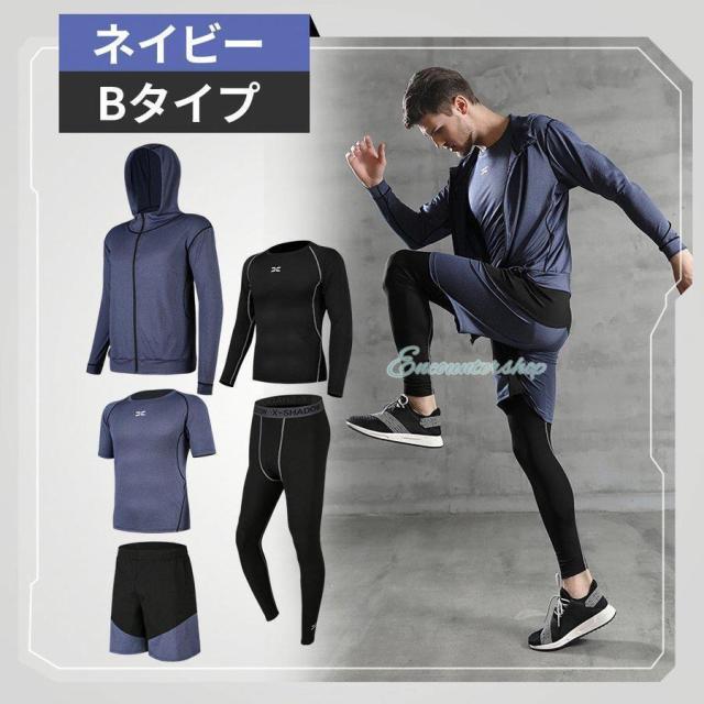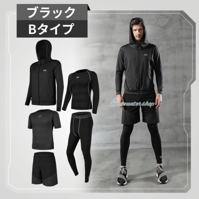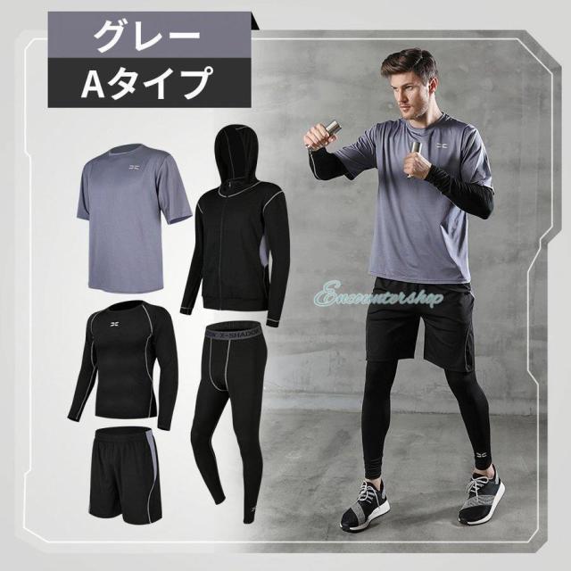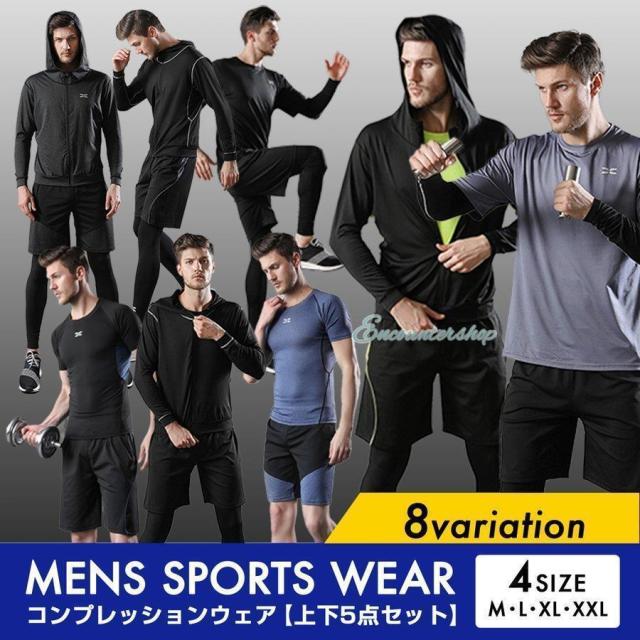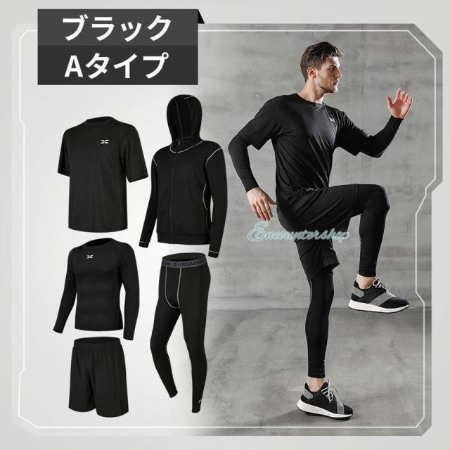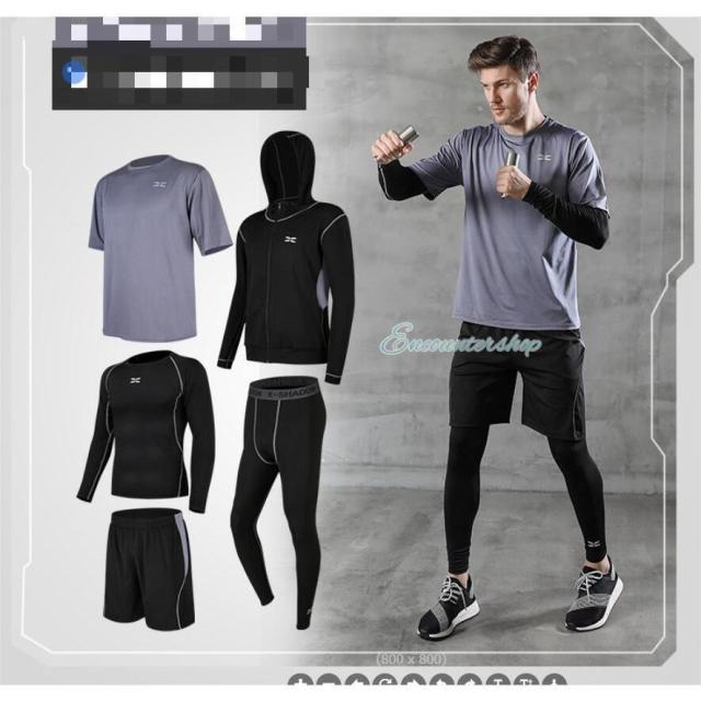 半袖シャツ?長袖シャツ?パーカー?ショートパンツ?レギンスの5点セットのスポーツウェア。