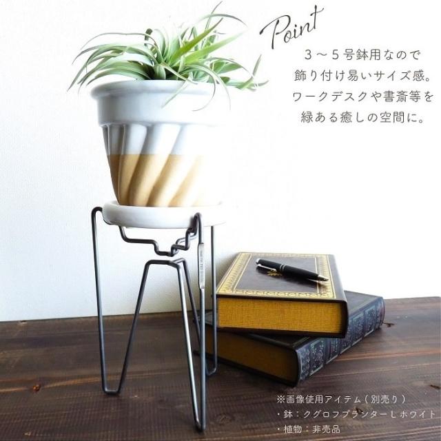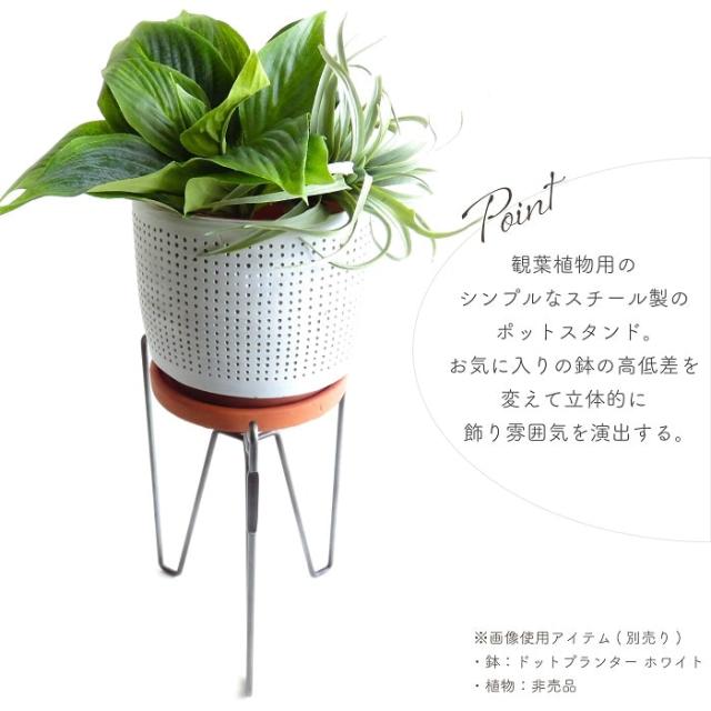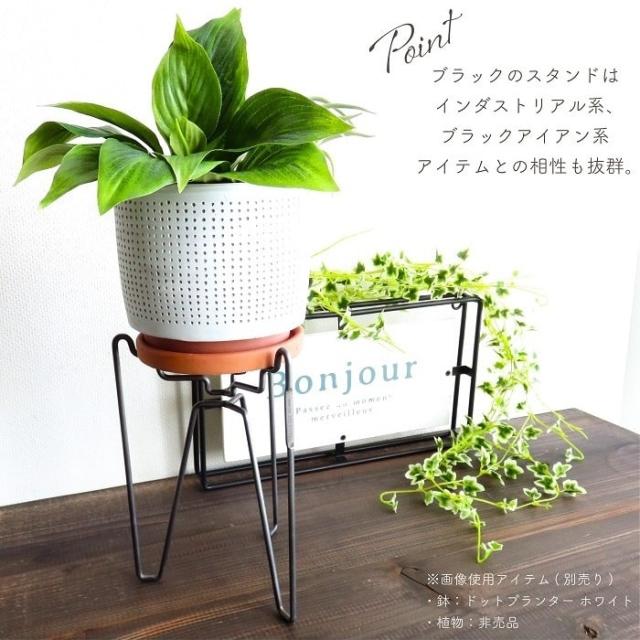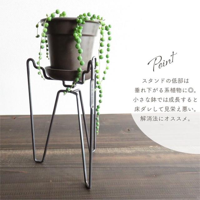 両サイズともに3号〜5号(直径約13.5cm未満まで)の植木鉢に対応、無骨なスチールの素材感が鉢の足元をクールに演出してくれるスタンドです。