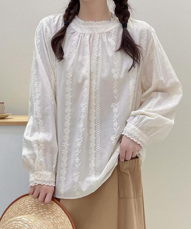繊細な刺繍とフリル襟が特徴的なブラウスです。袖口のレースと身頃のふんわりとしたラインが、可愛らしさを引き立てています。シンプルなシルエットのブラウスに刺繍を施した、女性らしさが感じられるアイテムです。リラックス感のあるシルエットが、カジュアルにもエレガントにも着こなせます。