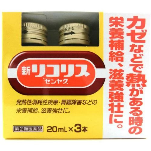 リコリス「ゼンヤク」は、甘い生薬・カンゾウ(甘草)エキスを配合した、発熱性消耗性疾患時等の 栄養面を配慮して作られた飲みやすい内服液剤です。