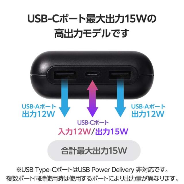 ●USB-Aポート×2、USBType-C(TM)ポート×1の3ポートから出力可能。USB-Aポートからは最大12W、USBType-Cポートからは最大15Wで充電できます。