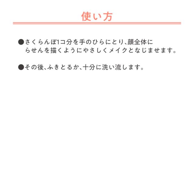 ・さくらんぼ1コ分を手のひらにとり、顔全体にらせんを描くようにやさしくメイクとなじませます。