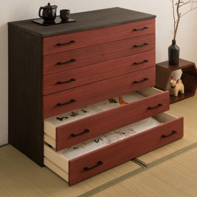 桐タンス 幅98cm 6段 朱色 朱雀 日本製 ( 桐 たんす 天然木 防虫 調湿 上置き兼用 完成品 チェスト 着物収納 桐たんす たとう紙 総桐 六杯 引き出し )