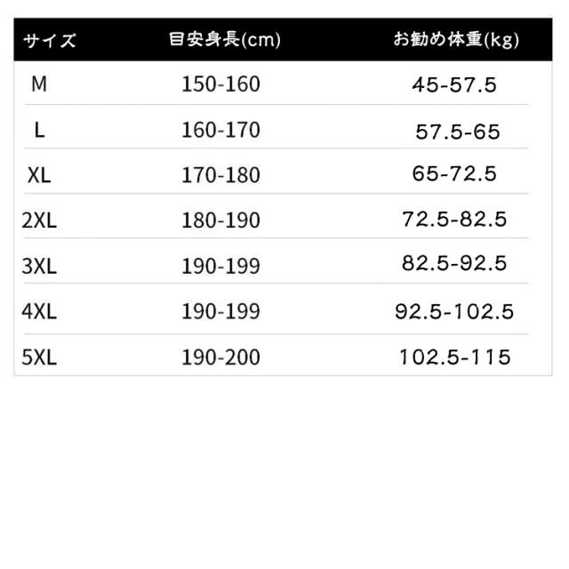 | サイズについての説明 | 《サイズ詳細》 XS:目安身長140-150cm、お勧め体重30-37.5kg S:目安身長150-160cm、お勧め体重37.5-45kg M:目安身長150-160cm、お勧め体重45-57.5kg L:目安身長160-170cm、お勧め体重57.5-65kg XL:目安身長170-180cm、お勧め体重65-72.5kg 2XL:目安身長180-190cm、お勧め体重72.5-82.5kg 3XL:目安身長190-199cm、お勧め体重82.5-92.5kg 4XL:目安身長190-199cm、お勧め体重92.5-102.5kg 5XL:目安身長190-200cm、お勧め体重102.5-115kg ※上記サイズは平置き実寸になります。 サイズ表の実寸法は商品によって1-3cm程度の誤差がある場合がございます。(単位:cm) |