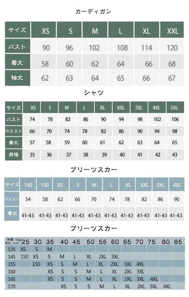 | サイズについての説明 | 【商品説明】 ◆セット内容:セーター+長袖シャツ+バッジ+スカート+リボン ※上記サイズは平置き実寸になります。 サイズ表の実寸法は商品によって1-3cm程度の誤差がある場合がございます。(単位:cm) |