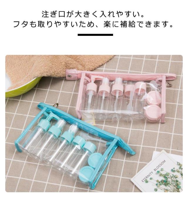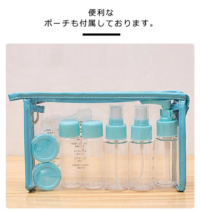 | 様々な質感の液体の保存に適したトラベルボトル。【12点セット】【収納ポーチ付き】 40mlボトル×2本,ポンプボトル×1本,スプレーボトル×2本,クリーム容器×2個,ろうと×1個,スプーン×2本,ラベルシール×1枚,ポーチの計12点セット いつものシャンプーやコンディショナー、ボディシャンプー、基礎化粧品等を簡単詰め替え。旅行や出張はもちろん、ジムやピラティス、ヨガ、キャンプ、温泉、サウナ等さまざまなシーンで活躍します! 注ぎ口が大きく入れやすい。フタも取りやすいため、楽に補給できます。 便利なポーチも付属しております。 | |