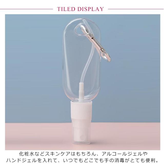 | カラビナ付き小分けスプレーボトルが登場。【7個セット】【50ml?60mlが選べる】 化粧水などスキンケアはもちろん、アルコールジェルやハンドジェルを入れて、いつでもどこでも手の消毒がとても便利。 ボトルを逆さにしても液漏れない優れた漏れ防止デザイン。 ベビーカー、バッグ、ベルトなどに付けて持ち運びがとてもラクラク。 | |