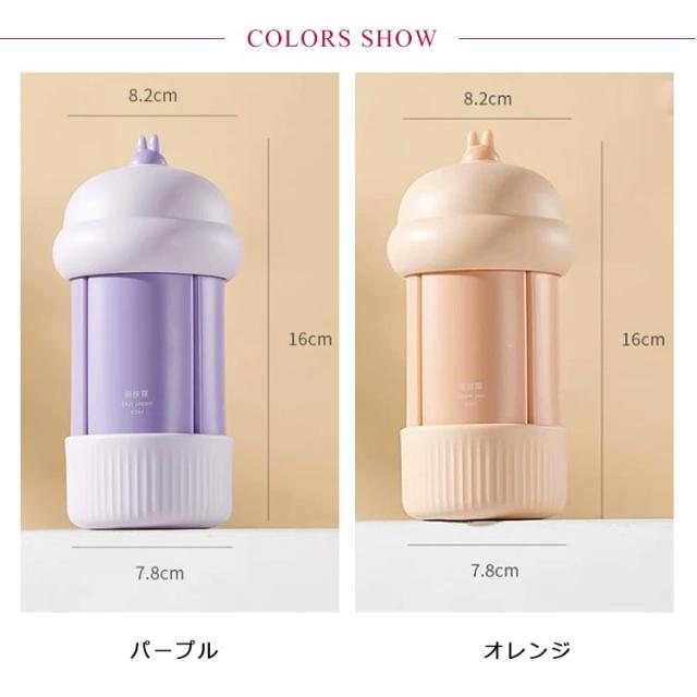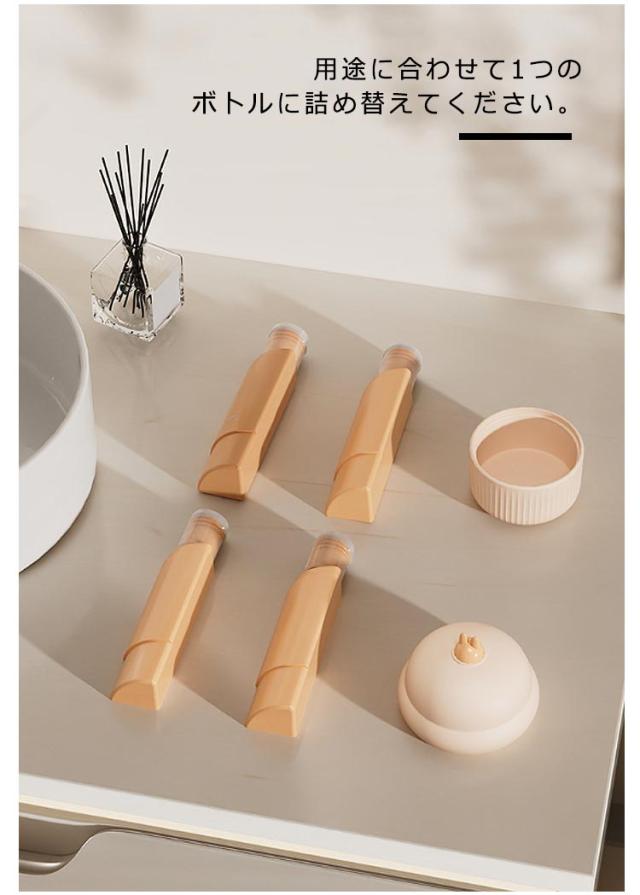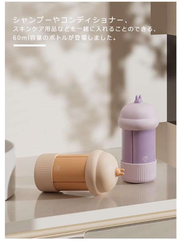 | かわいい兎耳付きの4in1タイプのトラベルボトル。【60ml×4本】 シャンプーやコンディショナー、スキンケア用品などを一緒に入れることのできる、60ml容量のボトルが登場しました。 収納ケース(7.8cm×16cm)は機内持ち込み可能サイズです! 旅行や出張だけでなく、日常生活での様々なシーンで活躍します。 注ぎ口が大きく入れやすい。フタも取りやすいため、楽に補給できます。 底のシリコンケースは、お風呂場に置いても滑らずに使用できるのも安全で嬉しい! 海外旅行、銭湯・サウナ、お泊り、キャンプ、プール・海など国内外どこでも活躍します! 用途に合わせて1つのボトルに詰め替えてください。 | |