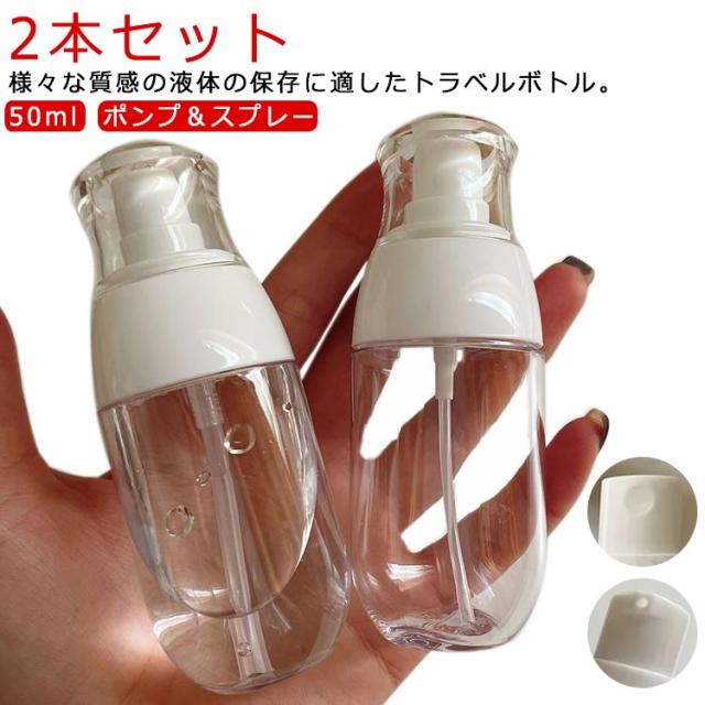 | 様々な質感の液体の保存に適したトラベルボトル。【50ml】【ポンプ&スプレー】【2本セット】 いつものシャンプーやコンディショナー、ボディシャンプー、基礎化粧品等を簡単詰め替え。旅行や出張はもちろん、ジムやピラティス、ヨガ、キャンプ、温泉、サウナ等さまざまなシーンで活躍します! 注ぎ口が大きく入れやすい。フタも取りやすいため、楽に補給できます。 透明ボトルなので一目で中身を確認でき、100ml以下の容量で国際線の機内に持ち込みが可能となります。 スプレーボトル:1回あたりも非常に細かいミスト状の噴霧可能です! ポンプボトル:ポンプ部分は押しやすく、程よい量がちゃんと出てきます。 | |