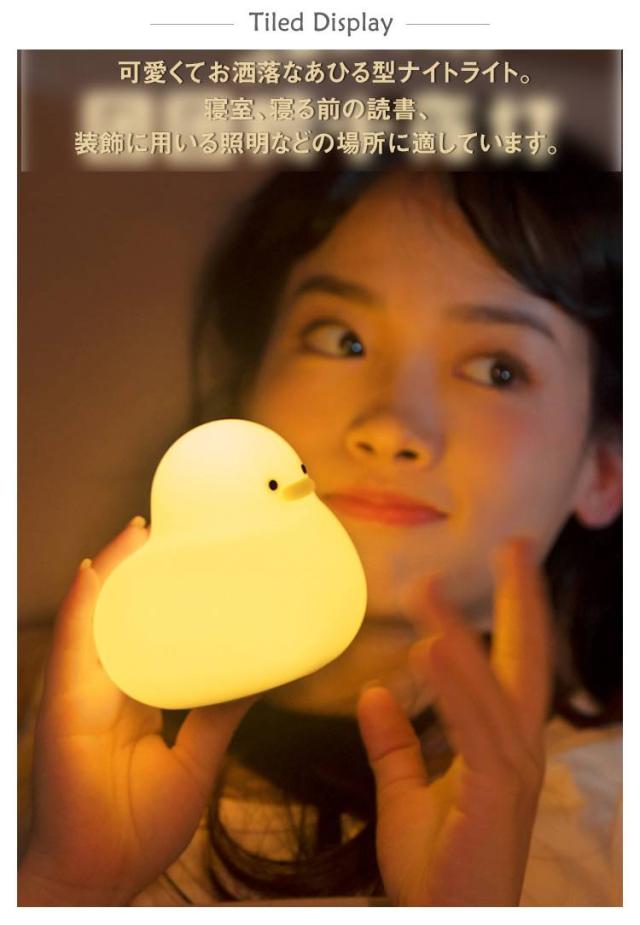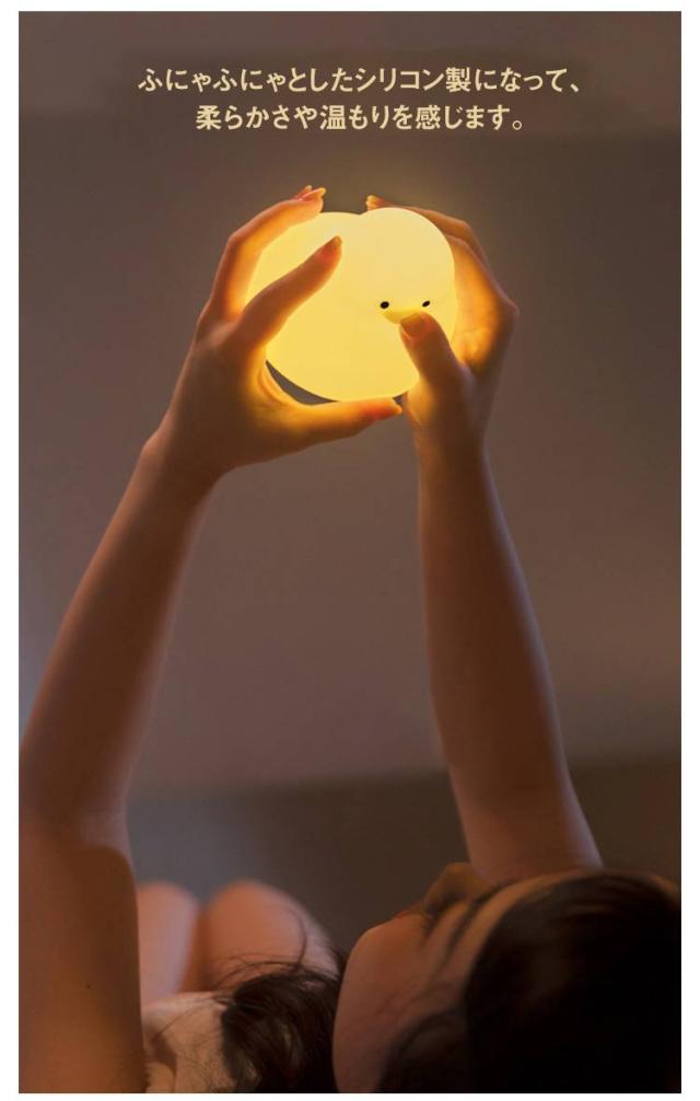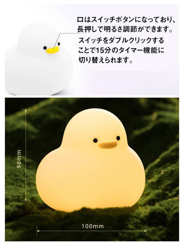 | 可愛くてお洒落なあひる型ナイトライト。 ふにゃふにゃとしたシリコン製になって、柔らかさや温もりを感じます。 寝室、寝る前の読書、装飾に用いる照明などの場所に適しています。 子供からお年寄りまで、全年齢対象が安心して使用出来ます。 口はスイッチボタンになっており、長押しで明るさ調節ができます。 スイッチをダブルクリックすることで15分のタイマー機能に切り替えられます。 | |