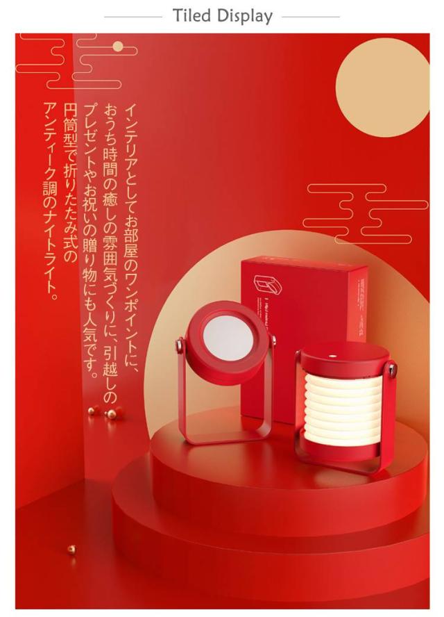 | 円筒型で折りたたみ式のアンティーク調のナイトライト。 タッチ式で簡単に3段階の明るさ調整が可能でとっても機能的。 ちょっと暗めの1段階は寝室やベッドルームでナイトライトとして。 2段階目なら夜中の授乳やオムツ替え時の明かりとして。 最も明るい3段階なら、ダイニングルーム、リビングルームの常夜灯として、また勉強用や読書灯として子ども部屋にも最適。 USB給電式で、コンセントのない場所や室内はもちろん、屋外のキャンプやアウトドアでも使える。 インテリアとしてお部屋のワンポイントに、おうち時間の癒しの雰囲気づくりに、引越しのプレゼントやお祝いの贈り物にも人気です。 ランプカバーを開けます: 1.両手を合わせて時計回りと反時計回りに回して開きます。 2.チューブを伸ばすとランタン状態になります。 ランプカバーを折りたたみ: まず下カバーの縁の出っ張りを上カバーの溝に合わせ、ランプの上下のカバーを両手で押しながら時計回りに回転させ、バックルを留め具に合わせてスタンドライトとして使用できます。 ライトヘッドは360°調節が可能で、持ち手部分はスタンドにもなる2way仕様と実用的。 | |