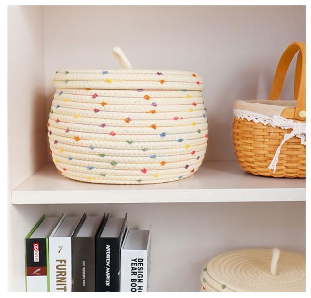 | ふた付き収納バスケット 天然コットン素材 抗菌 洗える 文具用品や化粧品、眼鏡、キーケースなどを収納するのにぴったりな小物入れです。 ロープで作られたバスケットはコットンで肌触りがとても良く、ずっと触っていたい素材感です。コットンなので、大切な洋服等も引っ掛けることなく安心して収納することが出来ます。 デスクの上や玄関、寝室の枕元など小物が多いところで活躍します。 | |