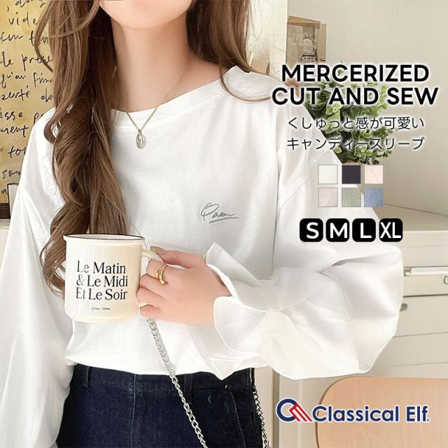 クラシカルエルフ春新作 トップス カットソー レディース Tシャツ 綿100% 長袖 キャンディースリーブ フェミニン シルケット 上品 光沢感 胸刺繍 オフィスカジュアル お出かけ おしゃれ リラックス くしゅっと感 大きいサイズ 2026ss ce1260394