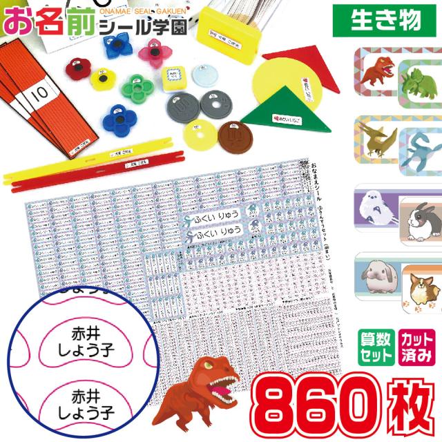 お名前シール学園 さんすうセット 860枚 生き物 恐竜 動物 算数 カット済み おなまえシール ネームシール オリジナル イラスト 小学校 入学準備 文具 筆記具 えんぴつ 持ち物 計算カード 数カード サイコロ おはじき コイン おどうぐばこ 時計 お祝い こども キッズ 子供