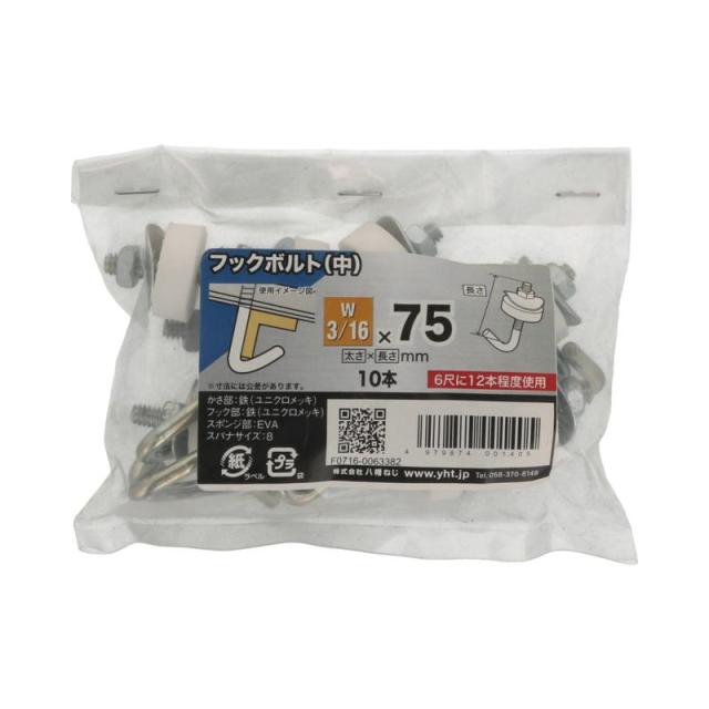 ●用途:波板に使用。●材質:鉄 ●表面処理:ユニクロめっき ●規格:インチねじ ●呼び径:3/16 ●長さ・厚み:75 ●ピッチ:24山 ●頭部形状:無