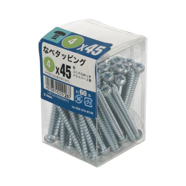 ●用途:薄い鋼板に締結する場合に使用します。規定の下穴をあけた鋼板(ねじのピッチより薄い)にセルフタッピングしながら締結します。切り粉は出ずナットも不要です。●材質:鉄 ●表面処理:ユニクロめっき ●呼び径:4 ●長さ・厚み:45 ●頭部形状:なべ ●頭部穴形状:十字穴(+) ●適用工具・サイズ:(+)ドライバー2番