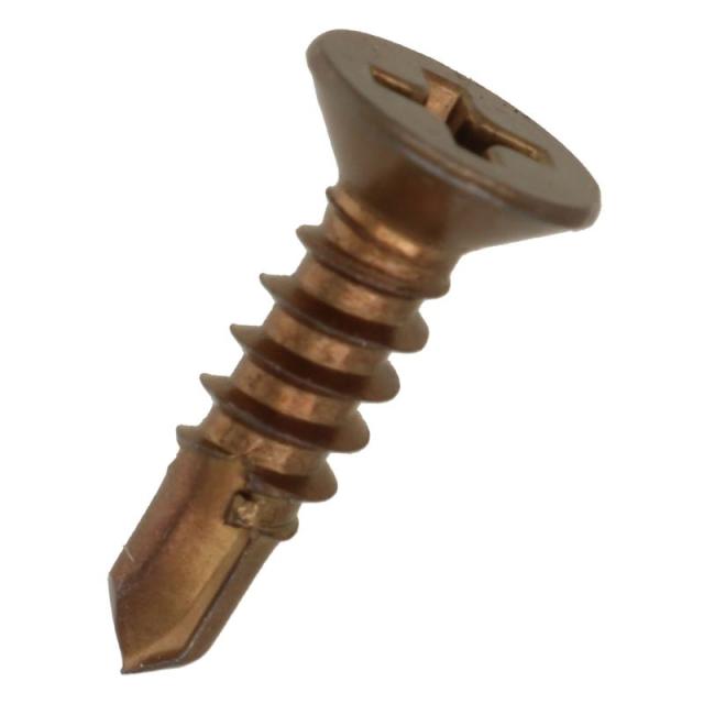 十字穴付きの皿頭タッピンねじで先端が切り刃になっています。切り刃で下穴をあけ連動してタップ立て、締付けまでがドリルねじ1本で出来ます。材質はステンレス(SUS410)でブロンズめっき。頭部が出ませんが座ぐり加工が必要です。