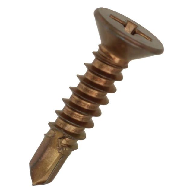 十字穴付きの皿頭タッピンねじで先端が切り刃になっています。切り刃で下穴をあけ連動してタップ立て、締付けまでがドリルねじ1本で出来ます。材質はステンレス(SUS410)でブロンズめっき。頭部が出ませんが座ぐり加工が必要です。