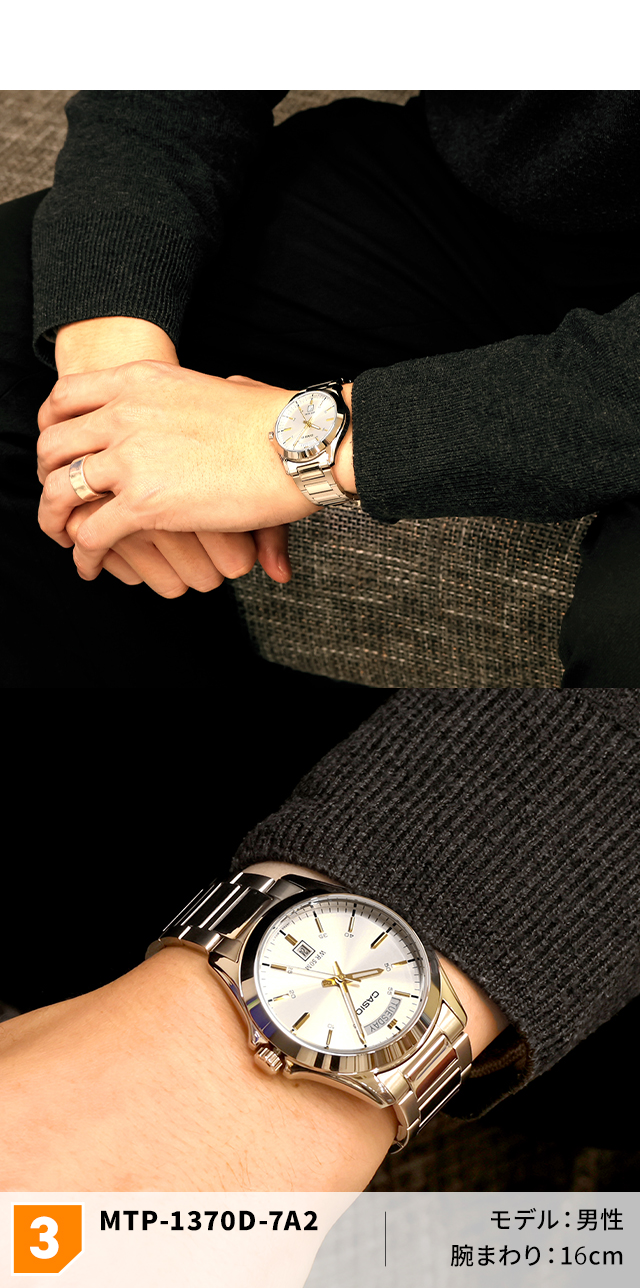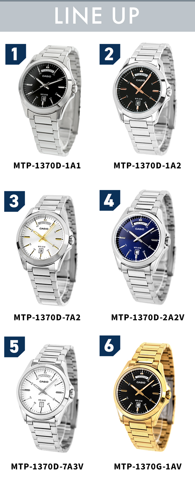7年保証キャンペーン カシオ チープカシオ CASIO スタンダード クォーツ 電池式 海外モデル クォーツ 電池式 メンズ 腕時計 MTP-1370D STANDARD アナログ ブラック シルバー 選べるモデル ◆オーソドックスなフォルムの上質な腕時計です。11時から1時位置まで拡張された日付表示窓は、フルスペルで曜日を表示する実用性と、文字盤に無理なく調和するデザイン性を兼ね備えています。時分針は多面構成で、美観と視認性を両立しているうえ、蓄光塗料が発光するため暗所でも時刻確認が可能です。インデックスは別パーツのアプライドで、針同様に多面的にカットされているので、どの角度から見ても程よく光を反射します。誕生日や記念日などのプレゼントにもおすすめです。 MTP-1370D-1A1VDF MTP-1370D-1A2VDF MTP-1370D-7A2VDF 日本未発売モデル