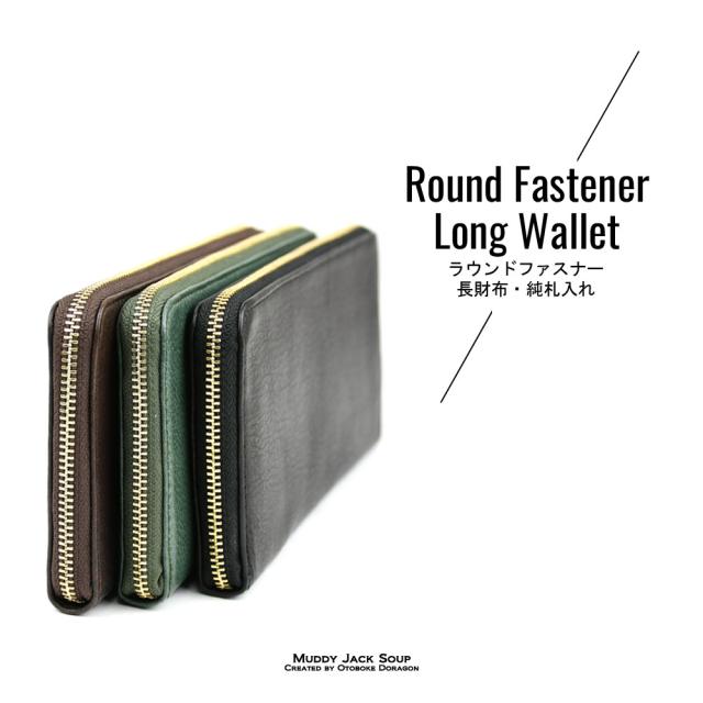 長財布 長札入れ 二つ折り 小銭入れなし カード8枚 メンズ 薄型 使いやすい ラウンド型 レザー 純札入れ ビルケース ナチュラルシュリンク ラウンドファスナー 経年変化 シボ 本革 革財布 ビジネス 実用的 スリム シンプル YKK SOFT2 Muddy Jack Soup マディジャックスープ