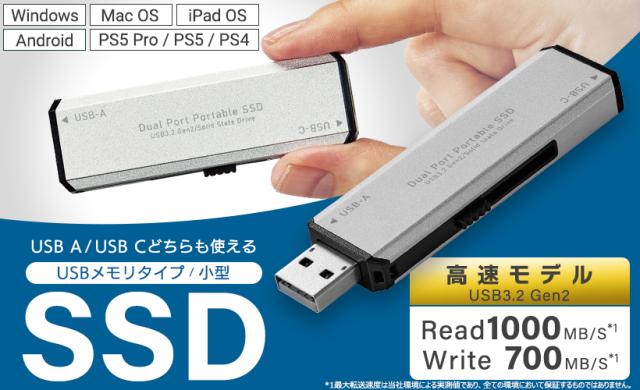 USBメモリサイズで読み込み最大1,000MB/s、書き込み最大700MB/sの高速データ転送を実現するUSB 10Gbps(USB3.2(Gen2))外付けポータブルSSDです。Windows、Macパソコンの他に PlayStation などさまざまなデバイスでお使いいただけます。