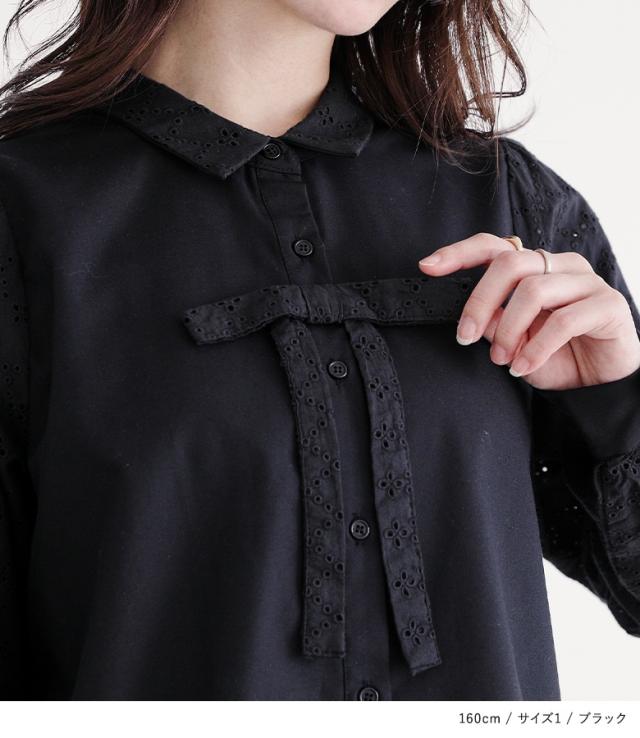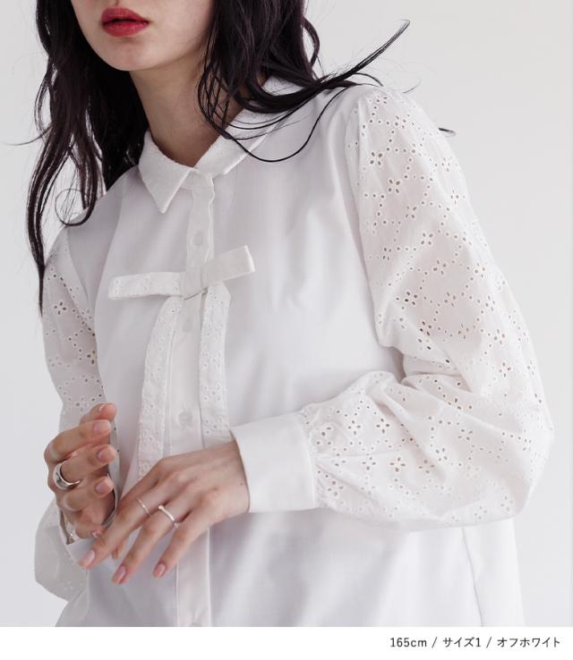 『コットンレースリボン付きブラウス』※メール便可※【10】[ブラウス レディース トップス 長袖 シャツ 襟付き コットンレース 切替 リボン レイヤード 重ね着 春 秋 冬]