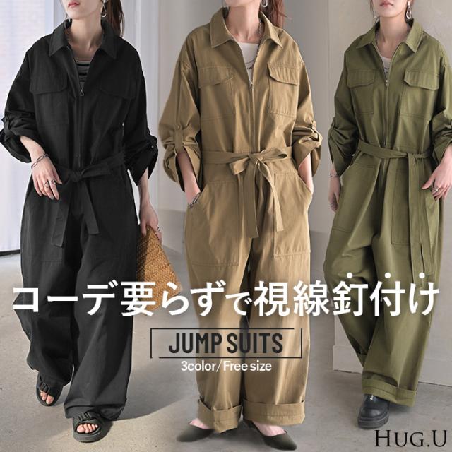 オールインワン つなぎ 綿100 レディース ジャンプ 一部3月中旬入荷 スーツ トップス ボトムス パンツ ロング オーバー ドロップショルダー ミリタリー オーバーオール ロングパンツ ジャンプスーツ カジュアル ミリタリー メンズライク 黒 カーキ 春 冬 HUG.U 秋新作