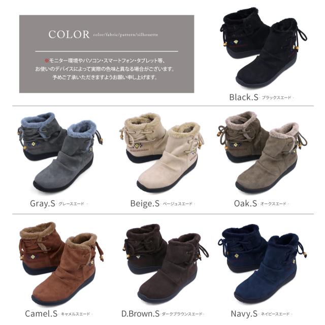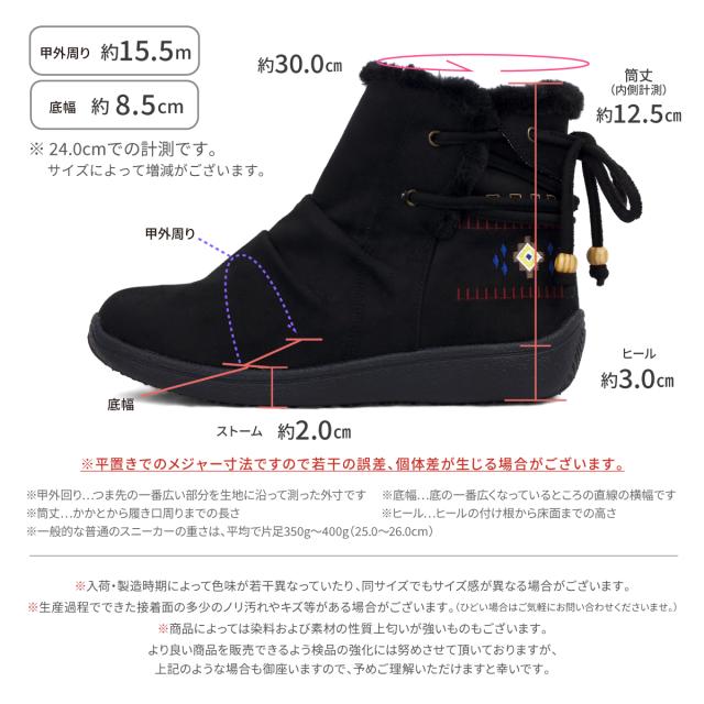 スエード調とチロリアン刺繍が施された可愛らしいショートブーツ。バックレースアップにはウッドビーズが付いており、甲部分のくしゅくしゅデザインがとってもお洒落で可愛らしいアクセント。3Eの幅広設計で履き心地ゆったり。回収したペットボトルを使用したリサイクルポリエステル糸ECO BLUE(エコブルー)に主成分ポリシリコン(鉱石)を使用した遠赤外線効果のあるTERAX(テラックス)を組み合わせたECO中敷きクッションを使用。血行促進効果で足元あったか。抗菌、防臭、帯電軽減効果もあり!撥水加工を施しているので水・汚れに強くお手入れもラクラク♪接地面から4cm4時間耐久の防水設計