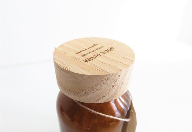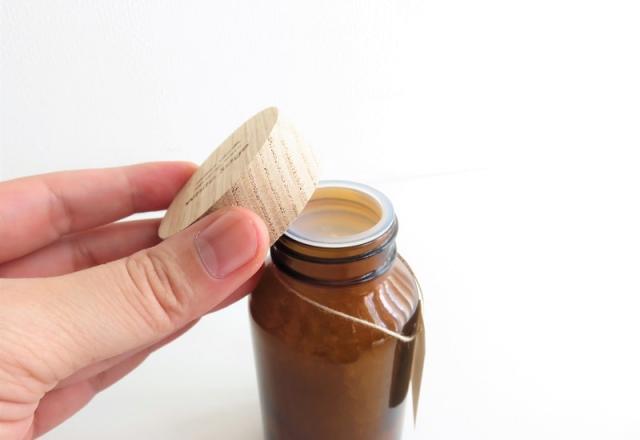 木製フタに焼き印された文字、落ち着きのあるブラウンのガラスボトル、温かみのあるナチュラルな雰囲気も魅力的。 |