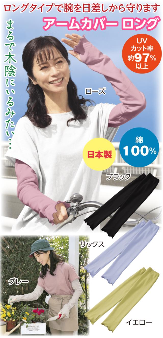 まるで木陰 アームカバー ロング 長袖 日除け 日本製 綿100% UVカット レディース ミセス シニア おしゃれ ファッション 40代 50代 60代 70代 80代 母の日 春物 夏物 春夏 爽やか 涼しい 遮熱 ブラック イエロー サックス ローズ グレー
