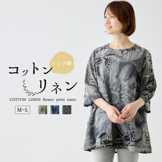 インド綿 ブラウス チュニック トップス レディース 七分袖 綿麻 コットンリネン 刺繍 アシッドウォッシュ スノーウォッシュ M〜L ゆったりシルエット 体型カバー 大人可愛い 春夏 花柄 おしゃれ 夏コーデ 旅行 カジュアル ゆるカジ リラックスウェア デイリーコーデ