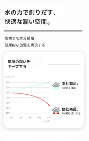 人の髪の毛よりも細かさミストを採用。自然蒸発しやすい為、床や加湿器周辺が濡れにくく快適に使用いただけます。