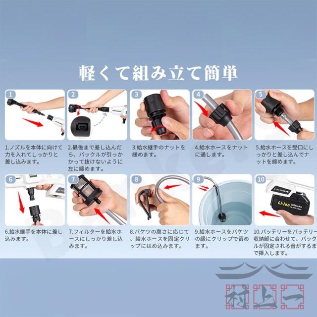 専用な水源の必要がなくて、池、バケツでも利用できて、面倒な水道栓の接続作業もなく洗浄の準備が簡単です。(*バケツが付属無し、別途で購入してください)
