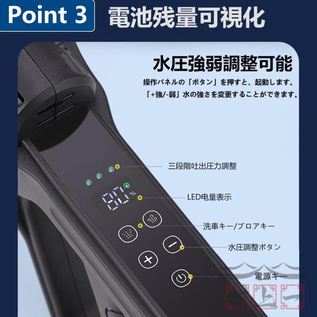 タンク式高圧洗浄機のガンと本体が一体化したハンディウォッシャーです。本体内部に搭載されたハイパワー大型純銅モーターは利用寿命が長いだけでなく、10-12MPa のパワフル噴射で頑固な汚れもしっかり落とし切ります。噴射距離も驚きの12mまでに達ち、 高い木や車の低部など届かない所の洗浄が楽になります。 7.0L/min水噴射量も出水効率が高いですし、頻繁にバスケットに加水必要がありません。無線高圧洗浄機は充電バッテリー式のコードレスで利用場所をとわず様々な場合に利用便利です。