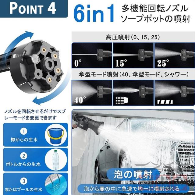 6-in-1多機能延長ノズル付き、0°/15°/25°/40°/シャワー/ストレートの六つ水噴射モードがある、使用シーンに合わせて選択できてとても便利です。3段階調節できる8-10MPaほどの吐出圧力、大掃除や洗車に便利な高圧洗浄機です(水圧がある程度高いと、汚れも落ちやすくなるので、8MPa以上のモデルお勧めします)