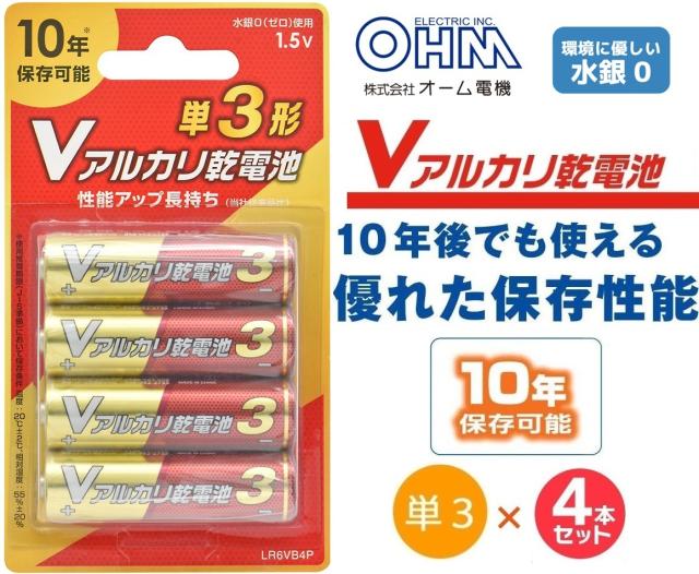 単3形アルカリ乾電池 4本パック 10年保存 オーム(OHM) Vアルカリ乾電池 単三電池 LR6VB4P 08-4133 防災用電池 長持ち電池 水銀0使用 ブリスターパック